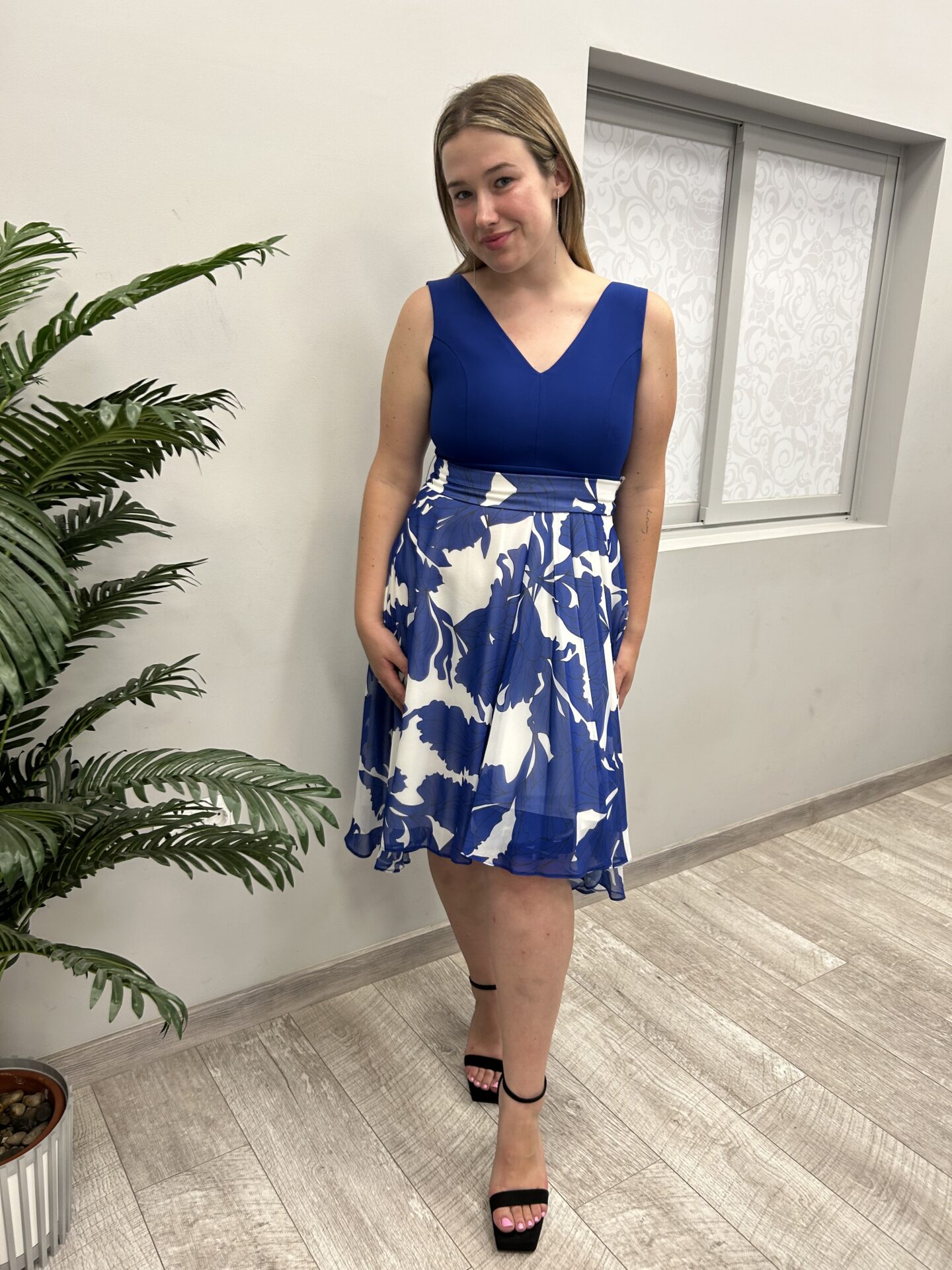 Vestido Azul Tinta con Falda Fluida Estampado Floral