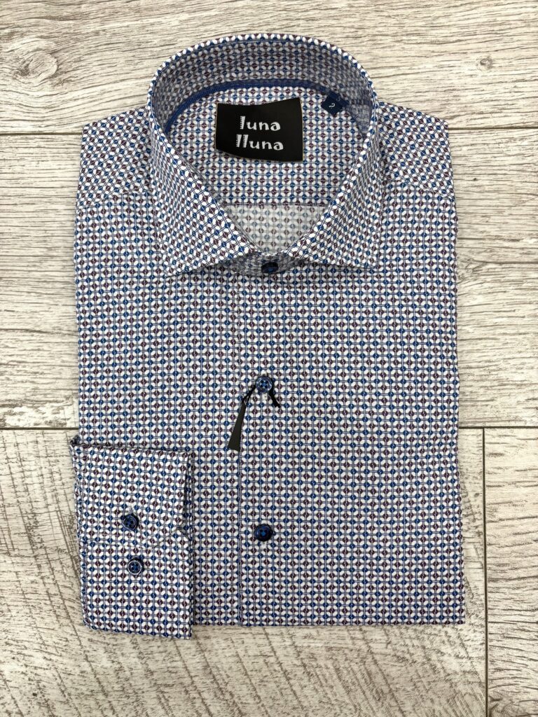 Camisa blanca con dibujo estampado en granate y azul
