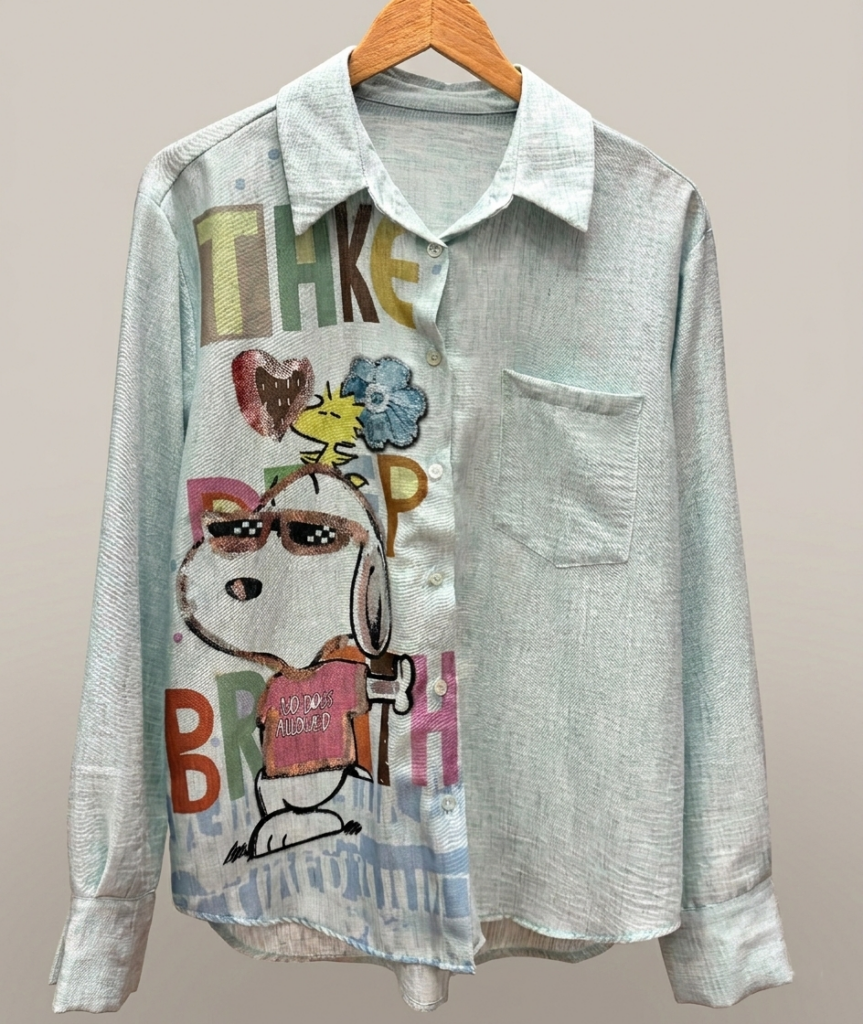 • Tiene un dibujo de Snoopy en la parte derecha de la camisa y un bolsillo.