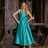 - La parte superior tiene una caída estilo casaca con estampados en negro.