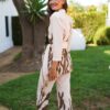 - Conjunto de blusa y pantalón en colores blancos y negros. La parte superior está compuesta por una blusa de escote cruzado y confeccionado en gasa, mientras que la parte inferior está confeccionado en crepe y tiene una caída recta.