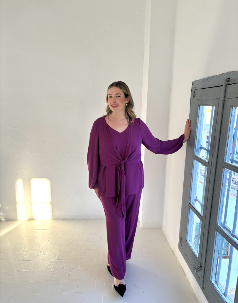 Conjunto pantalón palazzo y blusa de manga larga en tono morado intenso, con escote en V y un lazo frontal que estiliza la cintura. Sofisticado y elegante, ideal para ocasiones especiales.