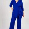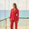 Conjunto en tono verde con pantalón recto y blusa suelta con capas confeccionadas en gasa.