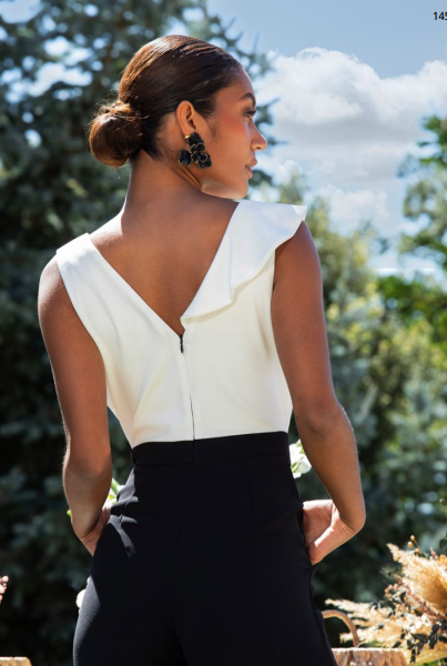 • Mono blanco y negro con un cuerpo de tirantes y escote cruzado.