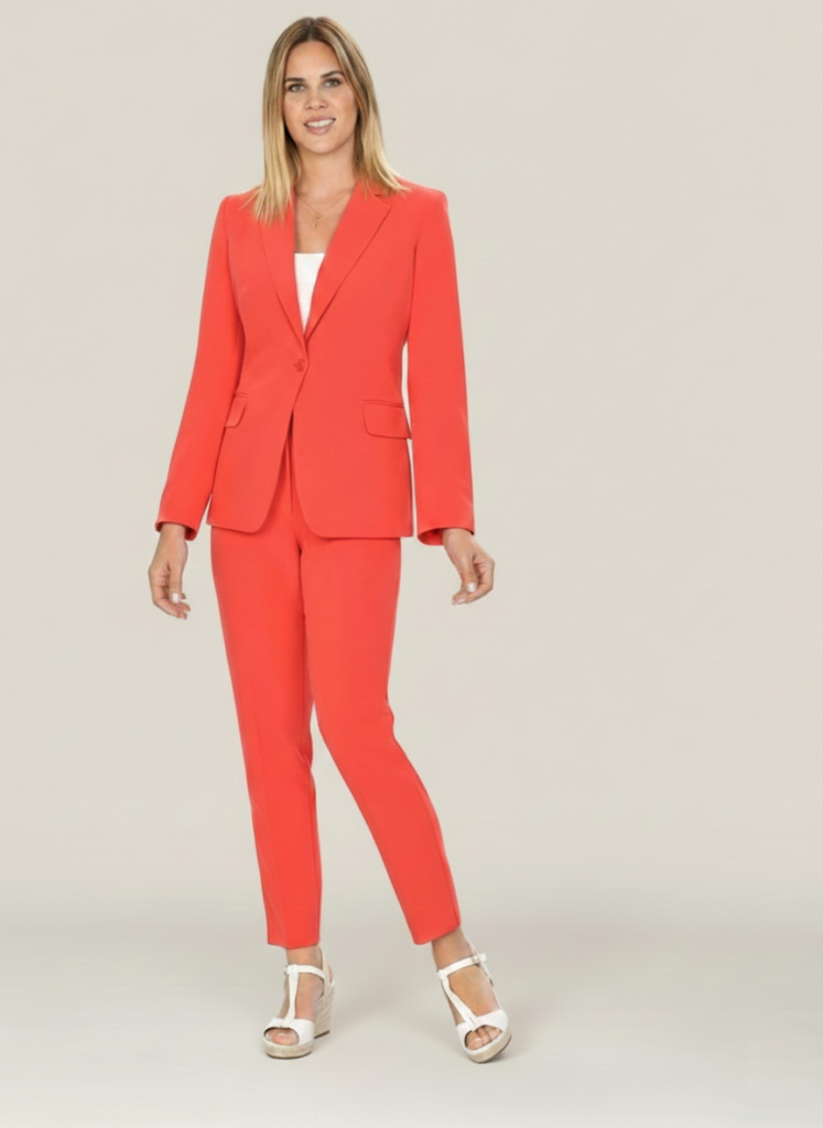 - Traje chaqueta en tono rojo coral.