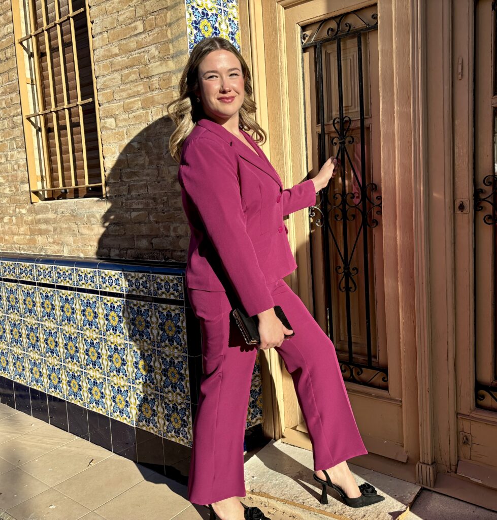 Traje pantalón en color magenta, en corte recto. La americana en corte clásico con solapas en pico y cierre con dos botones. Pantalón en  línea recta y tobillero con cinturilla alta. Perfecto para eventos especiales o looks profesionales.