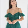 Vestido azul confeccionado en seda con un toque de brillos en la cintura y falda pomposa.