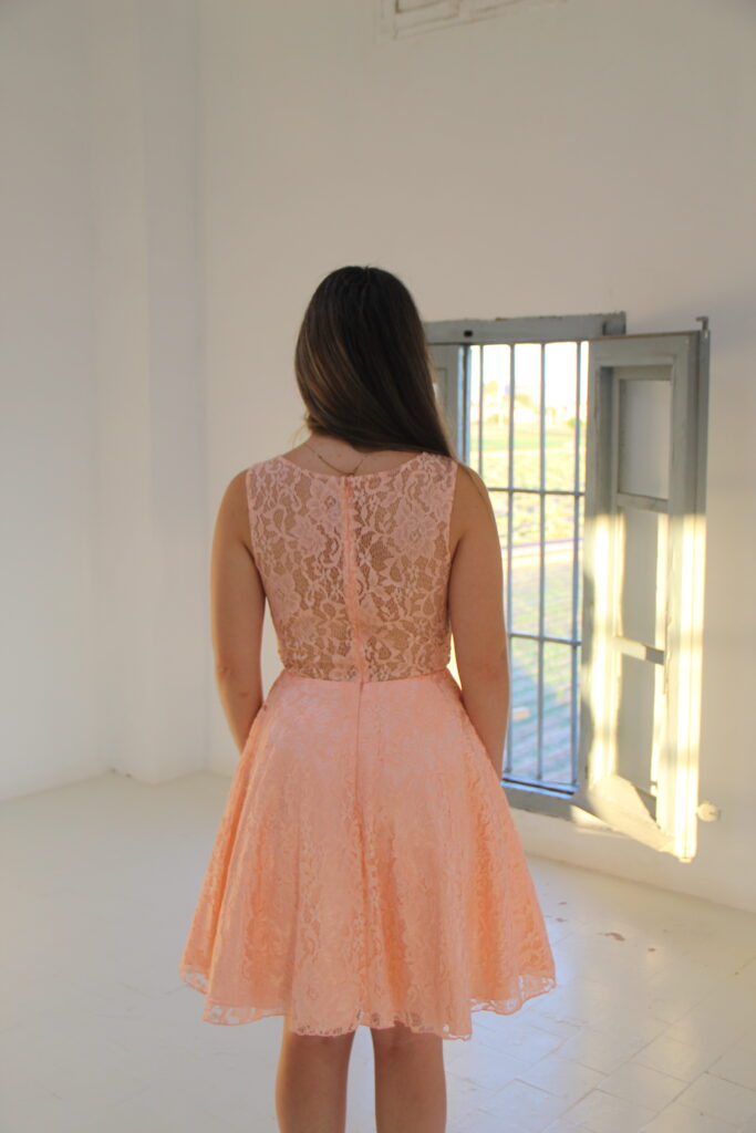 Vestido corto con falda de vuelo y cuerpo ajustado de encaje con un detalle de brillos en la cintura. Espalda descubierta formada por encaje.