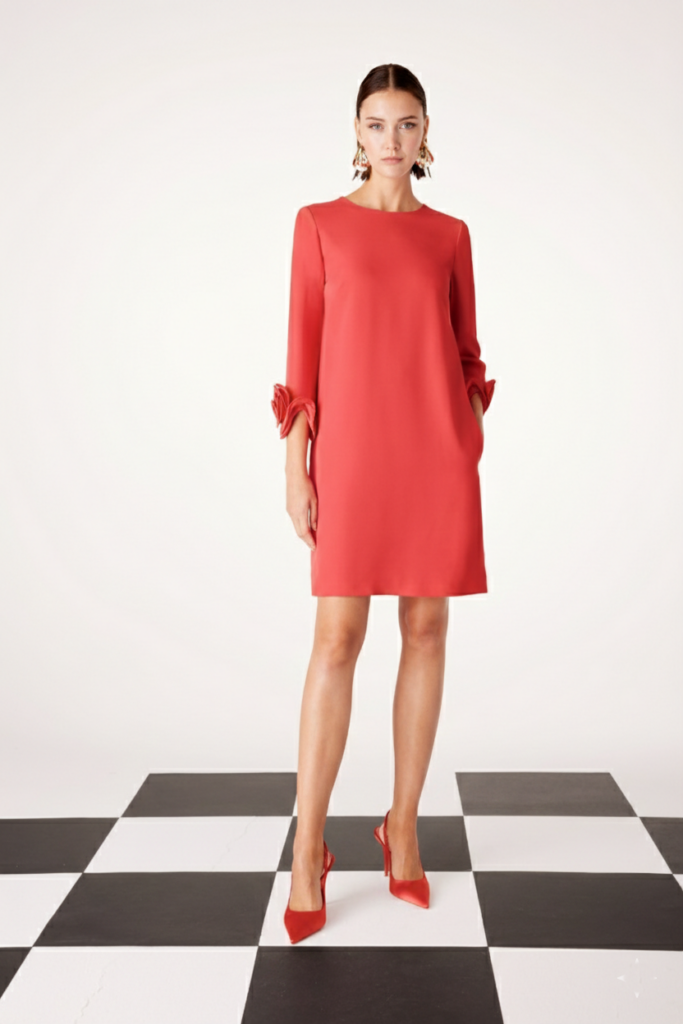 - Vestido corto en tono rojo con caída suelta y manga tres cuartos con detalle de flor al final de esta.