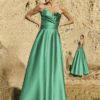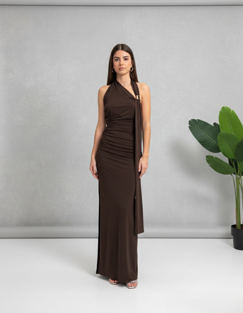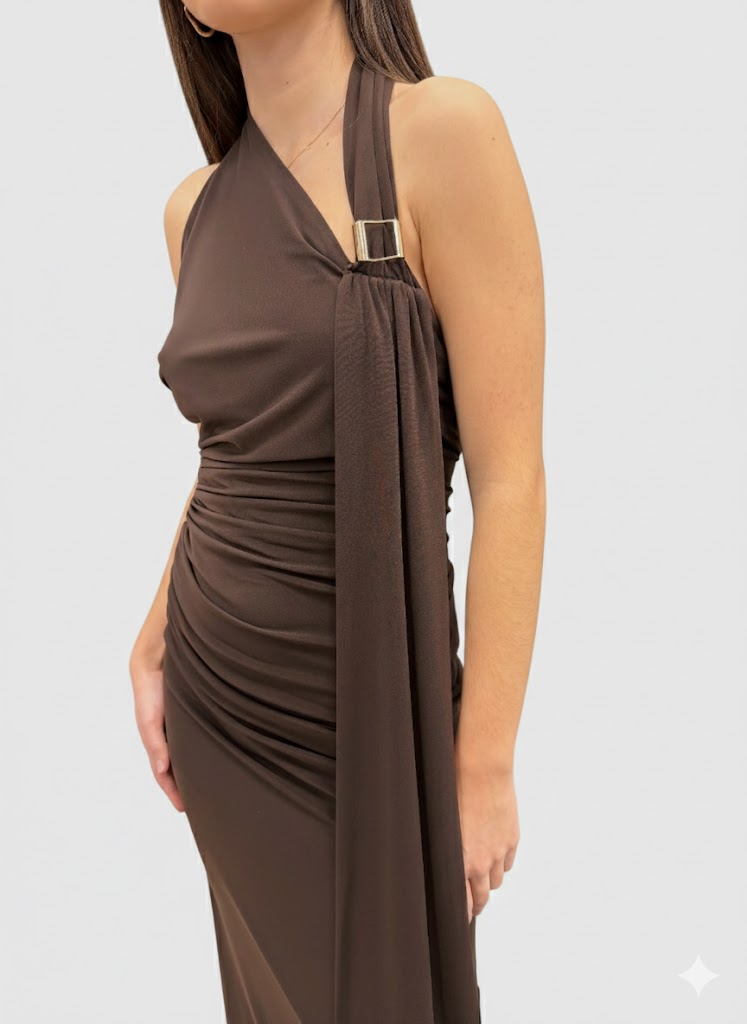 Vestido largo drapeado en tono marrón chocolate, con escote asimétrico y detalle con hebilla dorada. Capa fluida que recorre el frontal, añadiendo movimiento y un aire sofisticado a cada paso. Su corte se ajusta al cuerpo de forma impecable, confeccionado en lycra. Ideal para graduaciones, eventos que quieras dar tu toque personal.