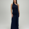 - Vestido largo drapeado en tono marrón chocolate, escote asimétrico y detalle con hebilla dorada.