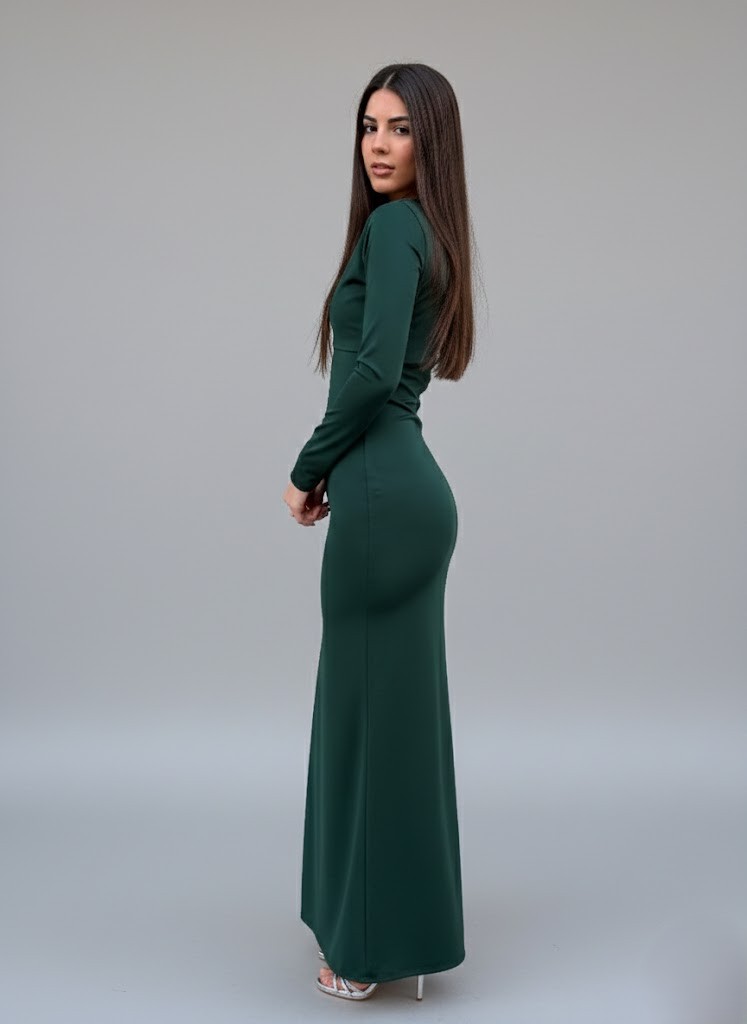 Vestido largo verde botella de corte entallado. Destaca por su escote asimétrico con una sola manga larga y un fruncido circular con botones metálicos en el pecho que crea pliegues decorativos. Por la parte detrás, incluye un fruncido vertical  en el centro de la espalda para entallar la silueta y una caída de falda fluida. Composición elástico.
