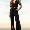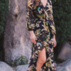 Vestido negro con estampado confeccionado en gasa formado por un escote en pico y manga larga y una falda fluida con abertura central.