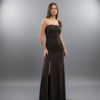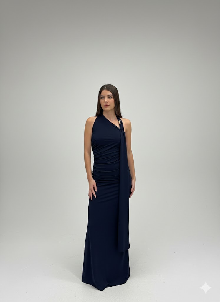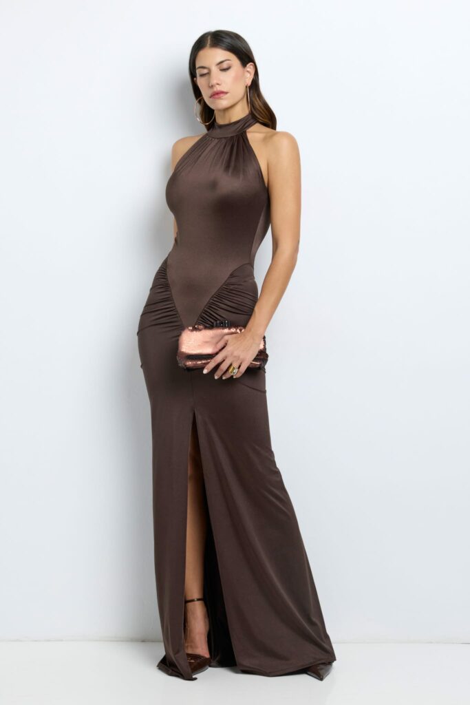 Vestido en cuello halter en color marrón chocolate con acabado satinado. El diseño destaca por sus paneles laterales con drapeado artístico que definen la cintura y una apertura frontal central en la falda que añade sensualidad y libertad de movimiento. En la parte de atrás el fruncido lateral se extiende hacia atrás para crear un efecto visual armonioso y entallado. Opción impecable para bodas de noche, cenas de gala o eventos formales y para esas graduaciones y estar radiante.