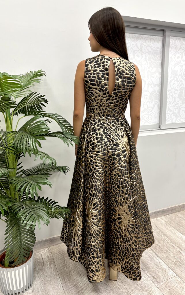 Vestido midi confeccionado en jaquard de color dorado y negro con estampado brocado animal print, formado por un escote de pico hasta la cintura acompañado de un cinturón con hebilla y falda fluida.
