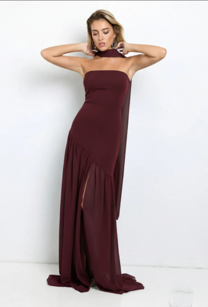 Vestido largo con escote en palabra de honor en tono burdeos.