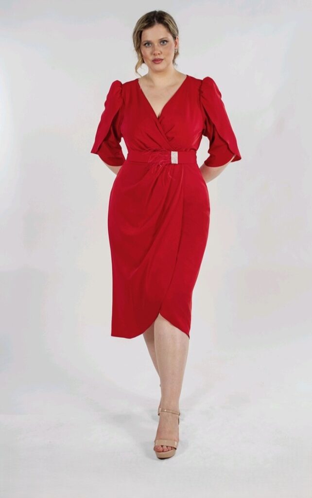 - Vestido midi en tono rojo con escote en V y mangas con ligero volumen.