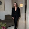 Vestido negro con encaje floral oscuro en la parte superior. Diseño con mangas largas, escote en V y espalda descubierta, complementado por un cinturón a juego. Ideal para ocasiones formales, combina clasicismo y modernidad en una silueta definida y vibrante.