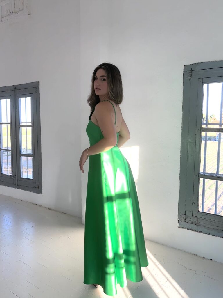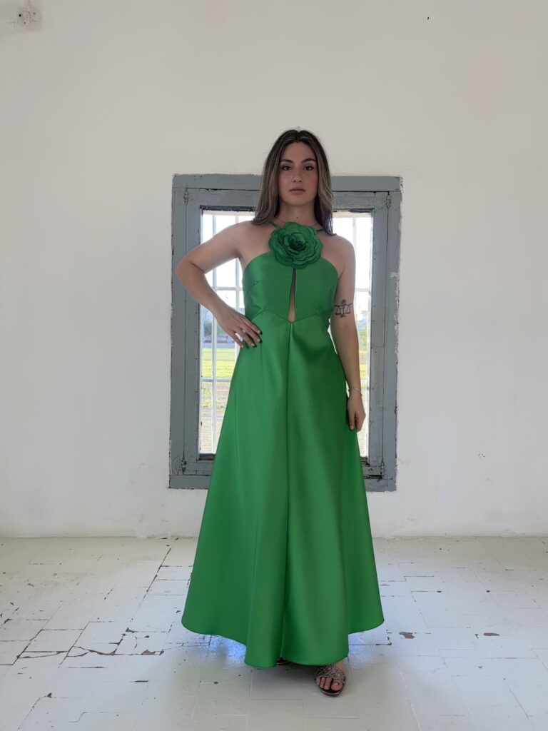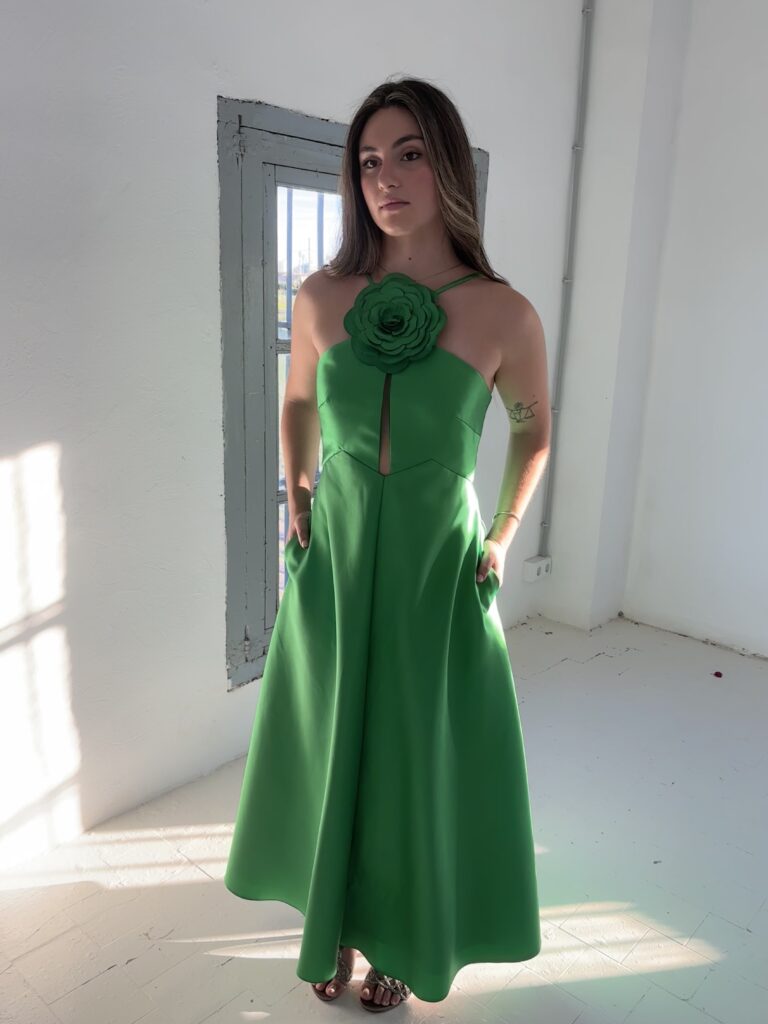 Vestido confeccionado en un mikado de color verde y corte midi acompañado de detalle flor situado arriba del escote en cuello halter y cut-out debajo
